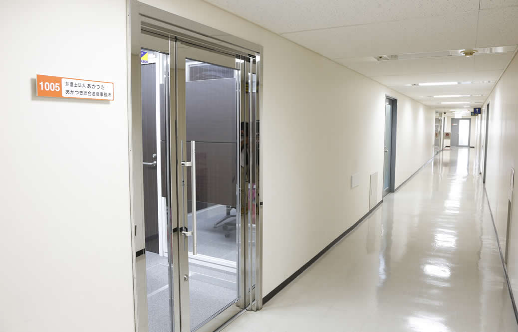 まず大阪駅前第4ビルへ(※第4ビルへのアクセスは上記地図、アクセスをご参照下さい)入って頂き、当事務所のある10階へ上がってください。「1005 弁護士法人あかつき あかつき総合法律事務所」の扉(写真1)を開けて頂きますと、当事務所に到着です(写真2)。どうぞお気軽にお越しください。